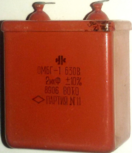 ОМБГ-1 630В 1мкФ конденсатор металлобумажный высоковольтный импульсные, выпускается в герметичном прямоугольном корпусе с лепестковыми выводами, предназначен для работы в цепях постоянного,  переменного и пульсирующего токов,конденсатор относится к разделу пассивных электронных компонентов.