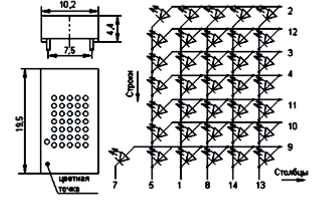Предназначены для визуальной индикации. Индикаторы имеют 35 элементов (7 рядов по 5 элементов в ряду) и левую децимальную точку, излучающих свет при воздействии прямого тока. Различные комбинации элементов, обеспечиваемые внешней коммутацией, позволяют воспроизвести цифры от 0 до 9 и децимальную точку; а также буквы русского и латинского алфавитов и другие символы.