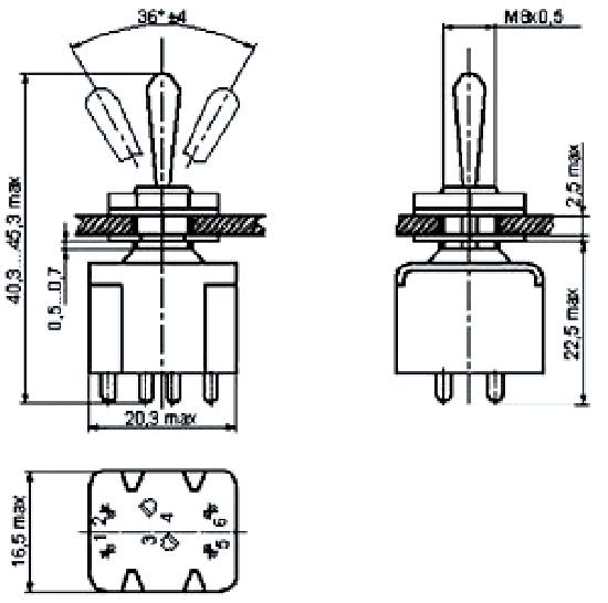 ПТ6-2В переключатель тумблерный, применяется для коммутации цепи сигнализации, питания и управления с напряжением 1х10-4В - 250В, силой тока 1х10-6А - 16А и коммутируемой мощностью до 1900Вт. Тумблеры выполняются с рычажным приводом, позволяющим укреплять резиновый защитный протектор и так и без него. В зависимости от фиксации рычага тумблеры выпускаются с фиксацией в трех положениях, в одном крайнем и среднем положениях и только в среднем положении. Монтаж проводов проводится пайкой.